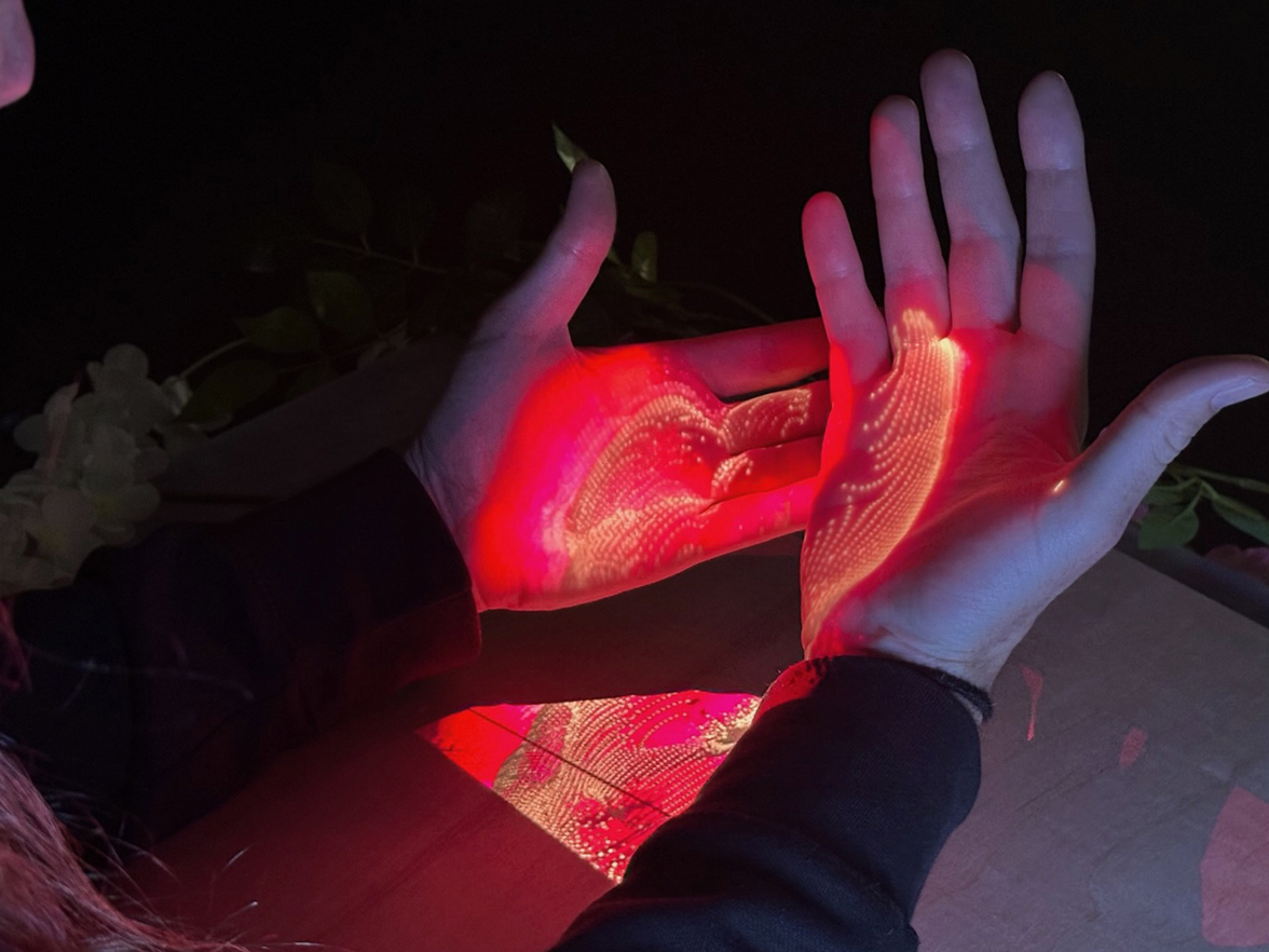 A 'lamp' that illuminates a space with visuals, that respond to the hand movement underneath the lamp.